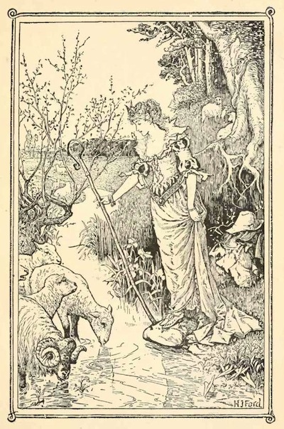 One day when she was keeping her sheep in a lonely tract of land, she suddenly felt a wish to dress herself in her robes of splendour. She washed herself carefully in the stream and, as she always carried her bundle with her, it was easy to shake off her rags and transform herself in a few moments into a great lady.